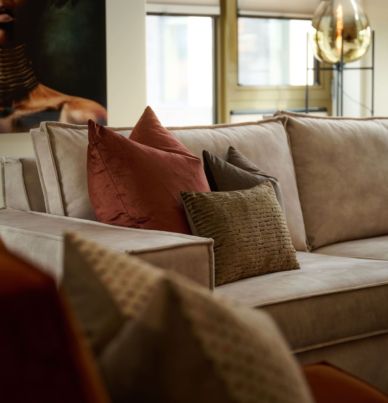 Die combinatie van karakter en elegantie zorgt voor balans in de ruimte. Het maakt de zithoek spannend, zonder dat het onrustig wordt.