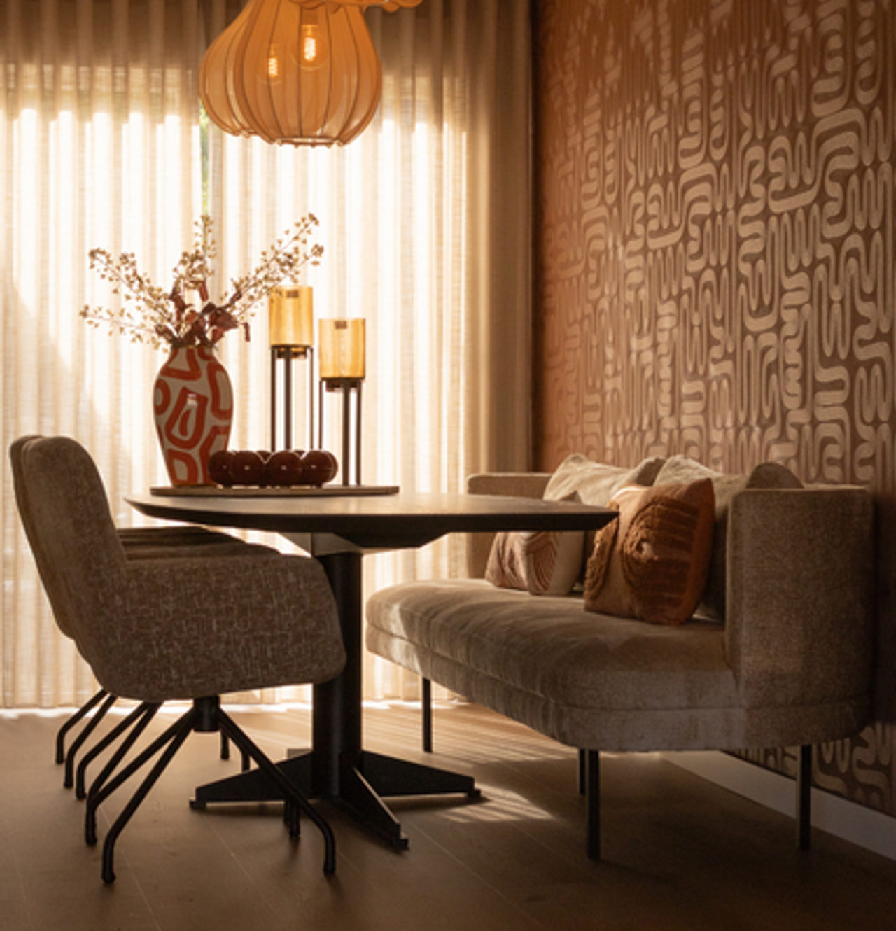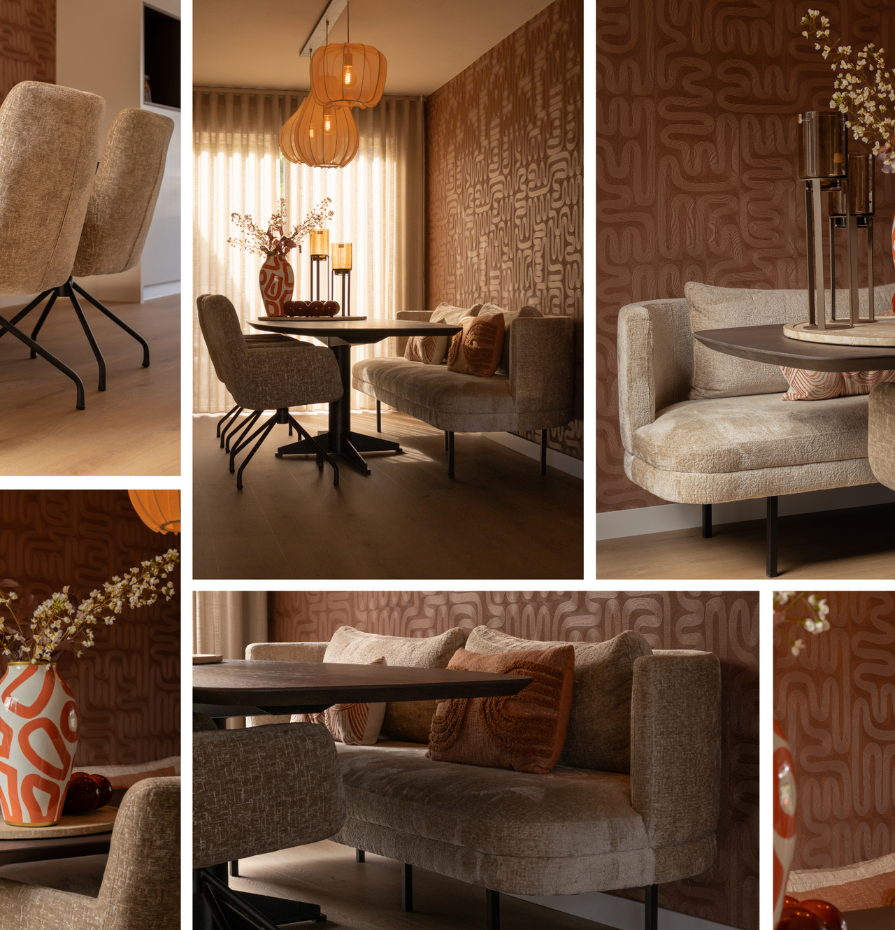 Wanneer kleuren, materialen en meubels goed op elkaar aansluiten, ontstaat er meer rust in een ruimte. De ruimte oogt minder druk en voelt daardoor overzichtelijker en ruimer aan. Bij deze eethoek is dit goed te zien. Zo is bijvoorbeeld het behang van Arte (kleur: Sarana/Mahogany 60702) is perfect gebalanceerd met de meubels.