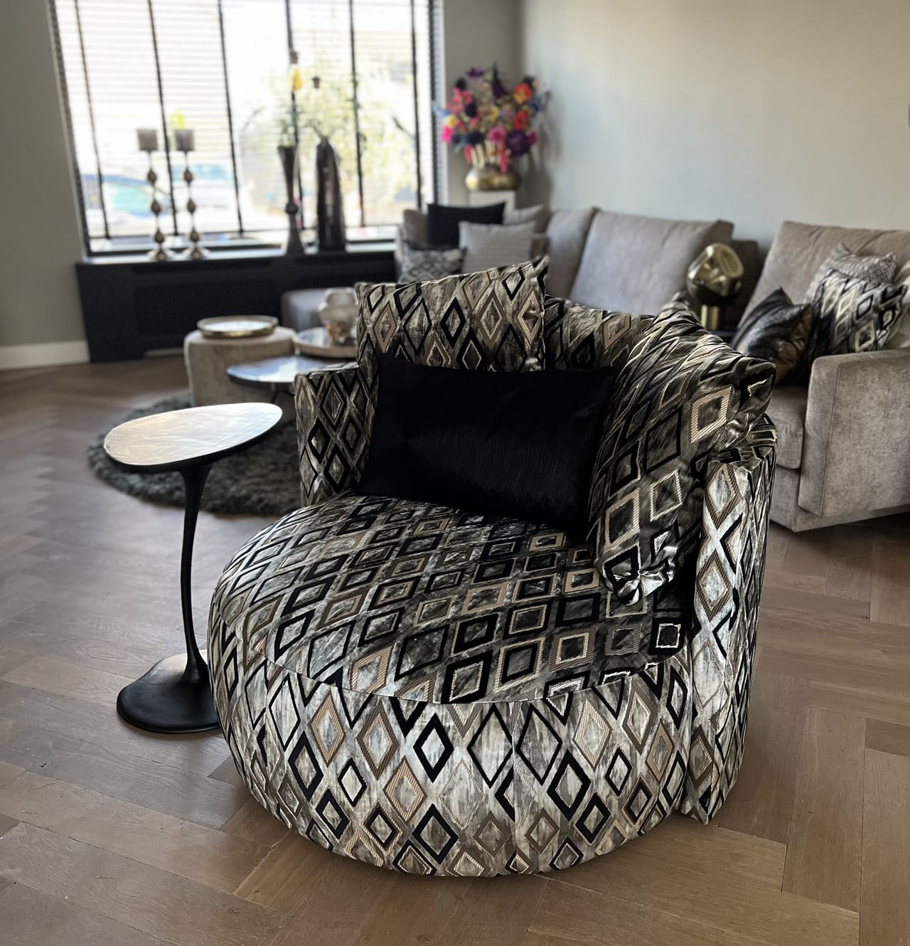 De Pastille Swing is in het interieur van Monique Smit een ware eyecatcher! Dit komt door de té gekke stof ‘Keymer Stage 92’ die op de fauteuil zit. De fauteuil heeft een draaifunctie waardoor je de fauteuil op alle plekken in je woning kan zetten – handig! Als finishing touch is de fauteuil afgestyled met bijpassende sierkussens.