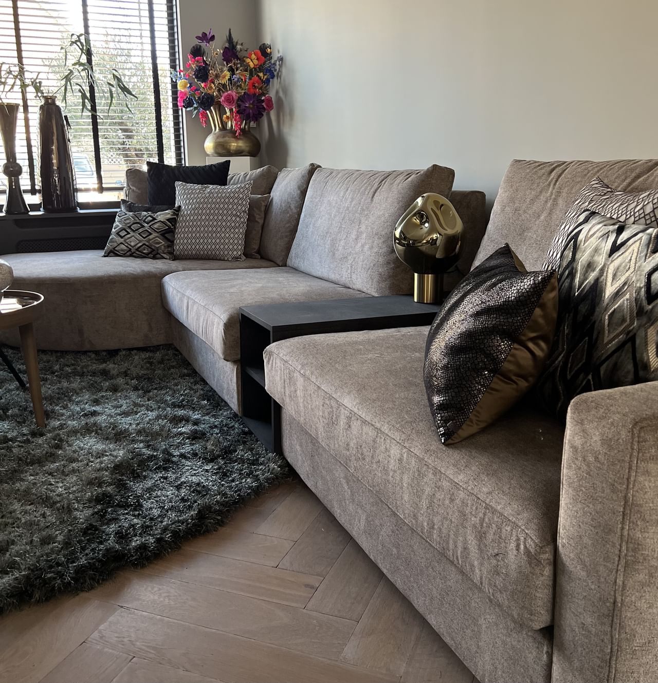 Monique's woonkamer straalt een uitnodigende sfeer van comfort uit, waar ontspanning en gezelligheid hand in hand gaan. Het middelpunt van de ruimte wordt gevormd door de Avelino bank. Deze charmante hoekbank van Passe Partout is verkrijgbaar in verschillende opstellingen en in meer dan 700 stoffen en leersoorten. De bank is gecombineerd met de Pommeline Innertable en het Splendid vloerkleed. Het vloerkleed geeft die extra sfeervolle touch aan de woonruimte door haar fluwelen uiterlijk met een subtiele glans.