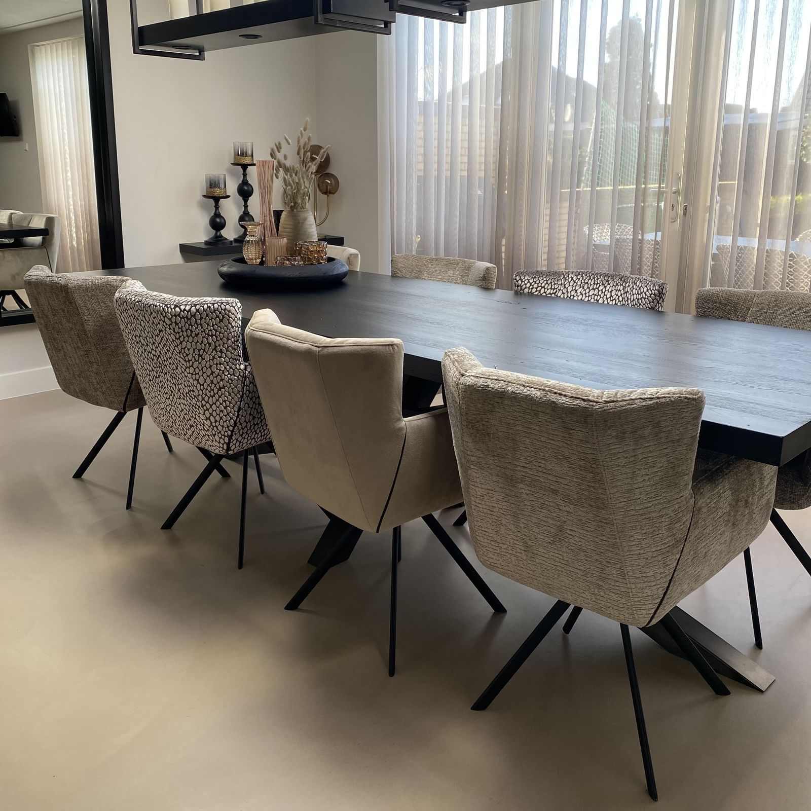 In de woonkamer is er speels effect gecreëerd door verschillende salontafels te combineren. De versteend hout tafels geven een gevoel van organische schoonheid. Wist je dat deze tafels gemaakt zijn van eeuwenoud hout dat is versteend? Hierdoor is elke versteend hout tafel uniek – hoe gaaf is dat?!