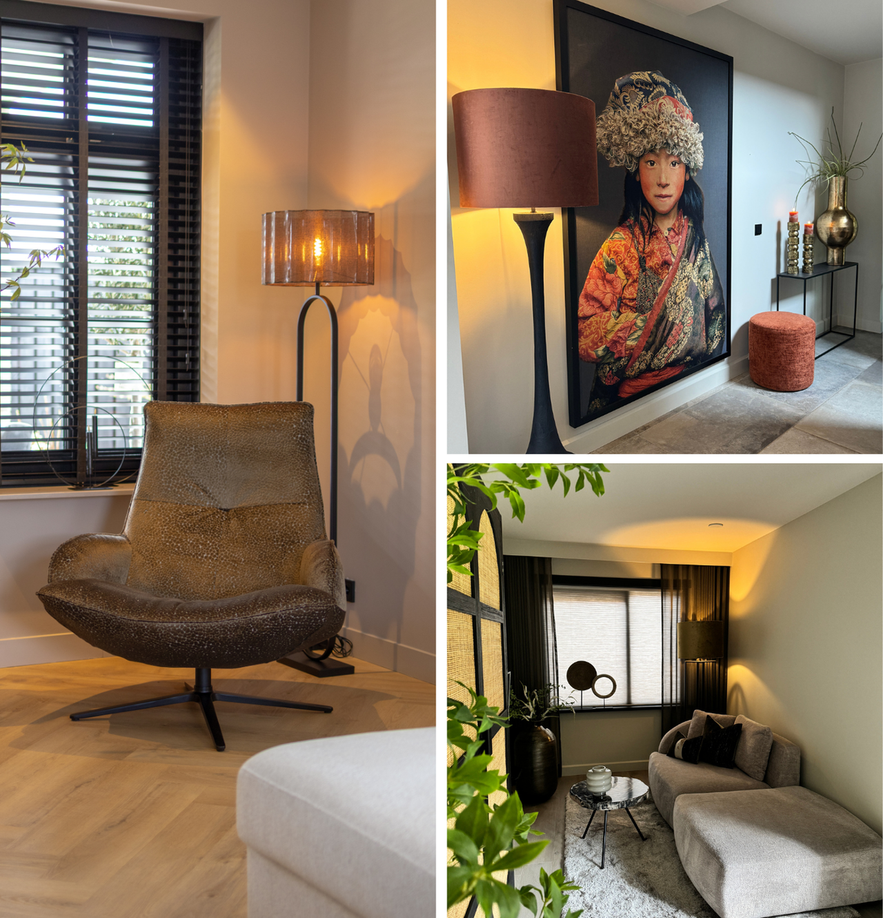 Verlichting speelt een cruciale rol bij het creëren van sfeer in huis. In plaats van één fel lichtpunt, is het slim om te kiezen voor meerdere lichtbronnen met zacht en warm licht. Een stoffen lampenkap kan bijvoorbeeld zorgen voor een mooie gloed die de ruimte direct knusser maakt. Door verschillende lichtpunten in een kamer te combineren, denk aan windlichten, vloerlampen en wandlampen, voelt je interieur meteen warmer en gezelliger aan. Wij adviseren we onze klanten graag over de juiste verlichting!